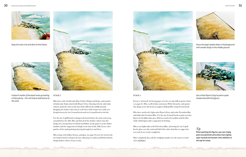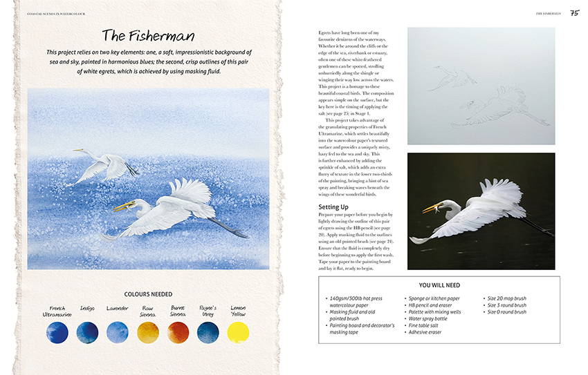 Coastal Scenes in Watercolour comprises 10 seaside tutorials, from ships in a harbour and fishing nets on a beach, to clifftop seabirds and a wetland estuary.